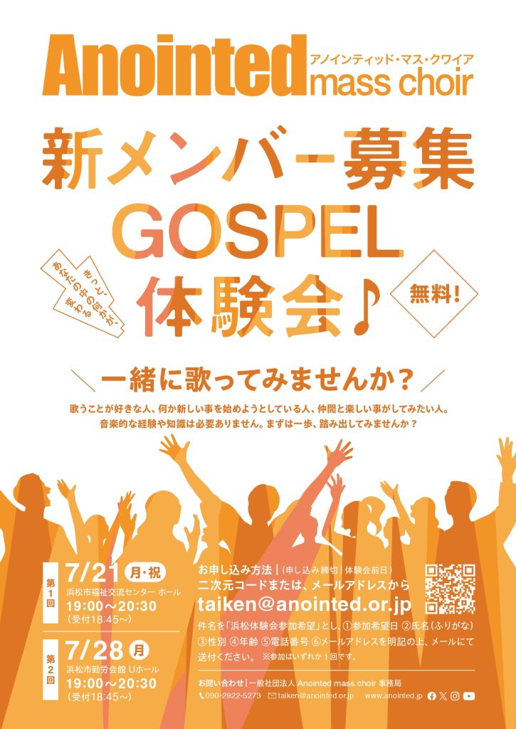7月21日と28日(月)に、浜松で「新メンバー募集GOSPEL体験会」を実施します。